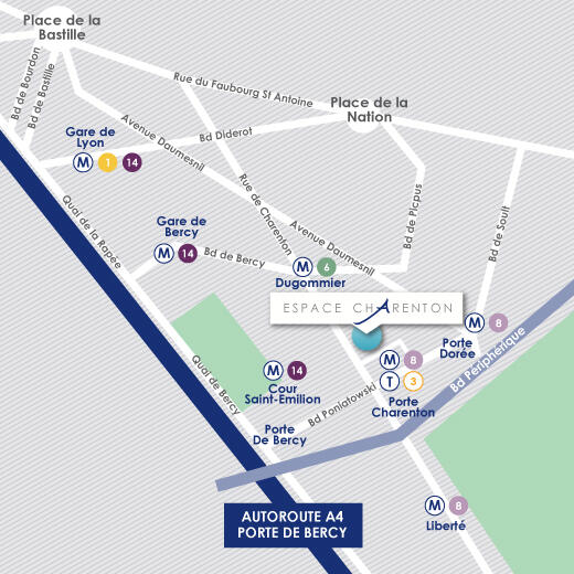 Afin d’éviter d’éventuelles difficultés de stationnement, nous recommandons aux Visiteurs d’utiliser les transports publics pour se rendre à l’Espace Charenton.